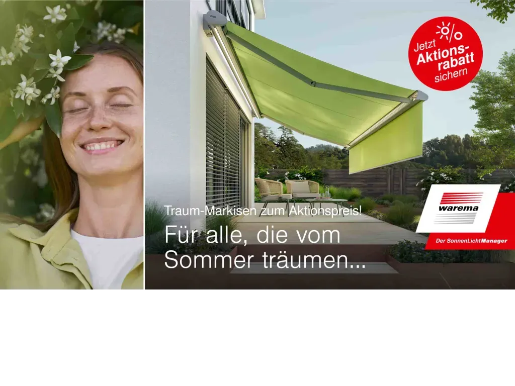 Bis zum 28.02.2026 bieten wir unsere beliebtesten Markisenmodelle G60, H60 und K60 zum Aktionspreis mit 10% Preisvorteil an. Wir erstellen Ihnen gerne ein unverbindliches Angebot.